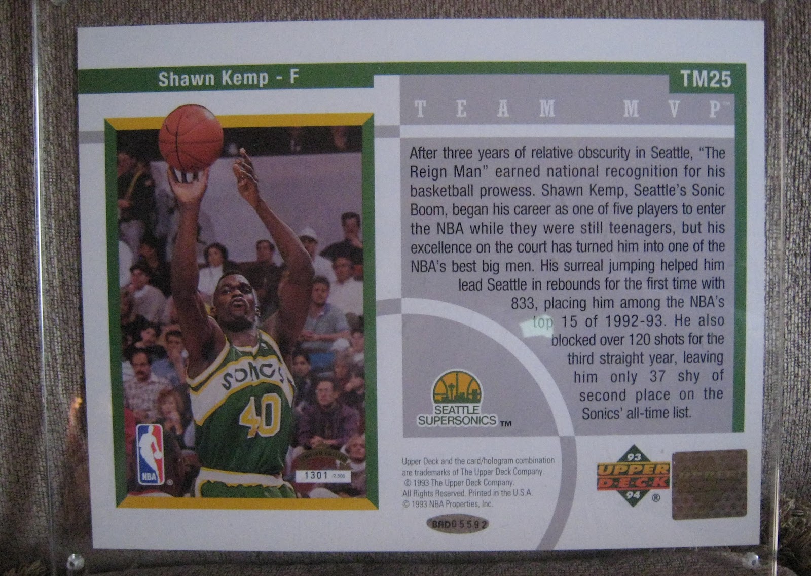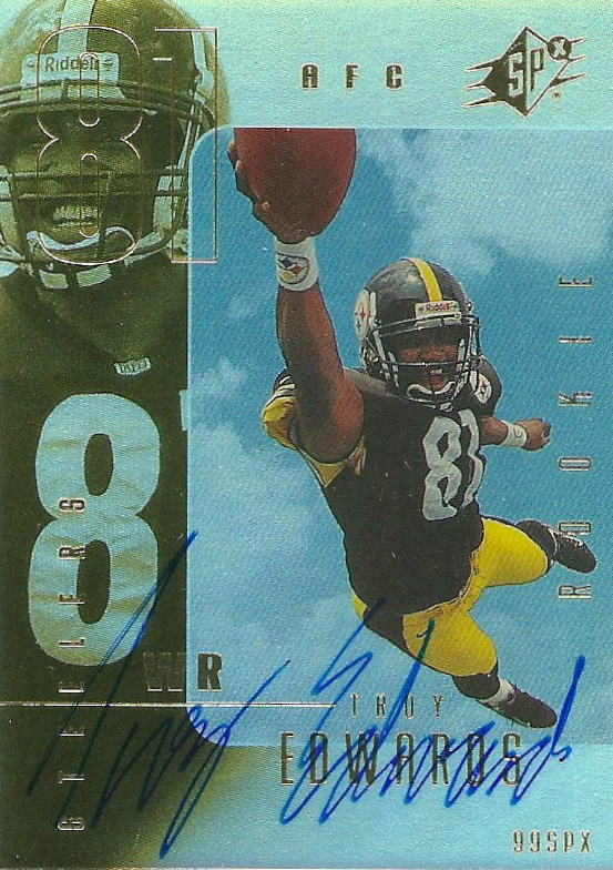 It's true what they say, "…it's all in the details". Check out this 1998 Upper Deck SPx ProMotion card of Warrick Dunn. The foiling, hologram and die cut details are nice, but look at the football helmet shaped Upper Deck hologram in the bottom right corner. If you look closely, you can even see an earhole. There was some definite thought put into the detail of this card.